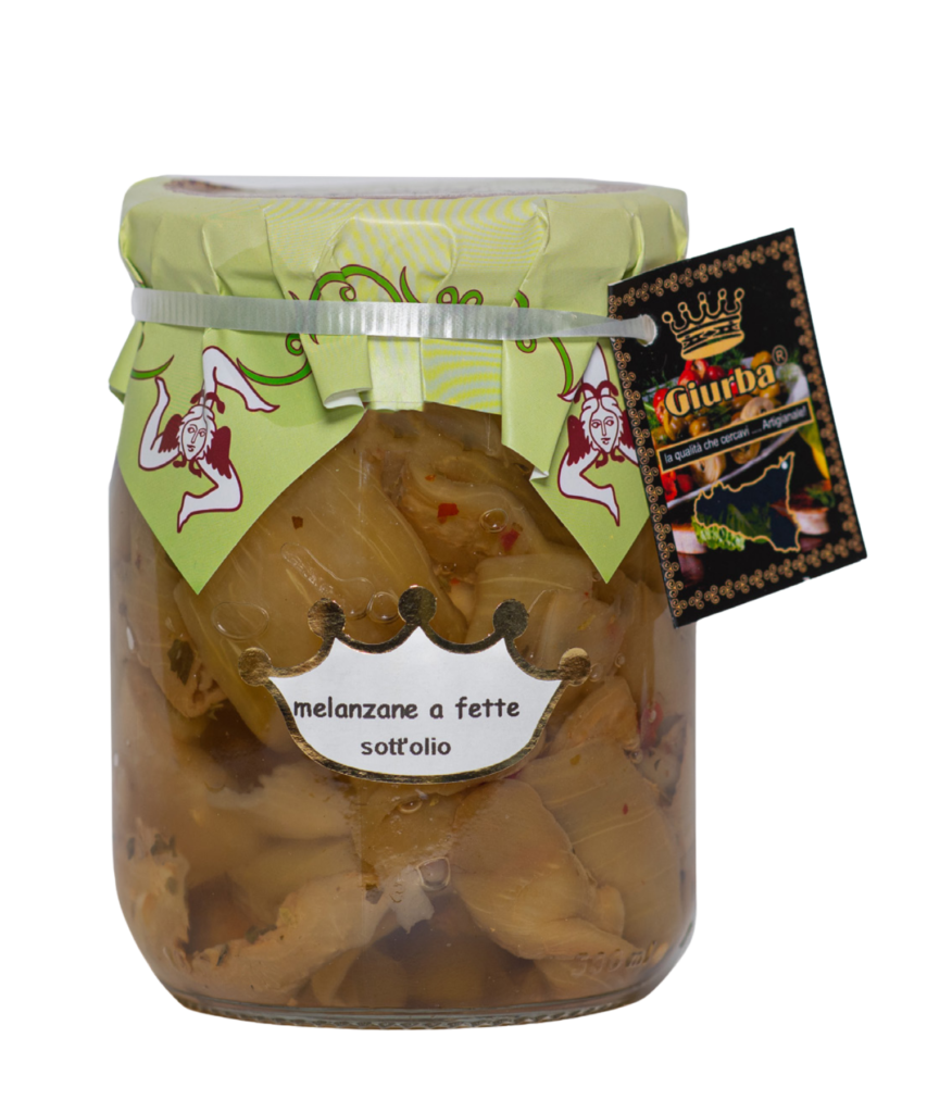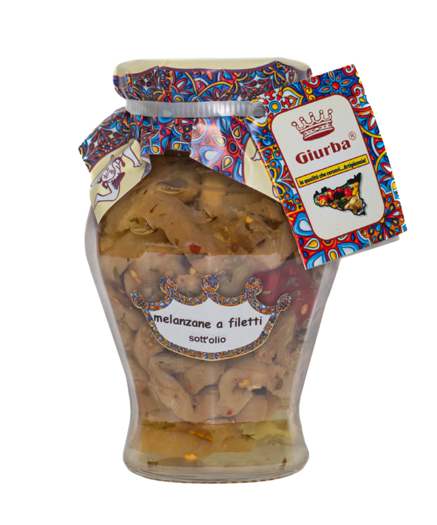 Eggplant fillets preserved in a tangy marinade with a rich blend of spices, offering a robust taste.