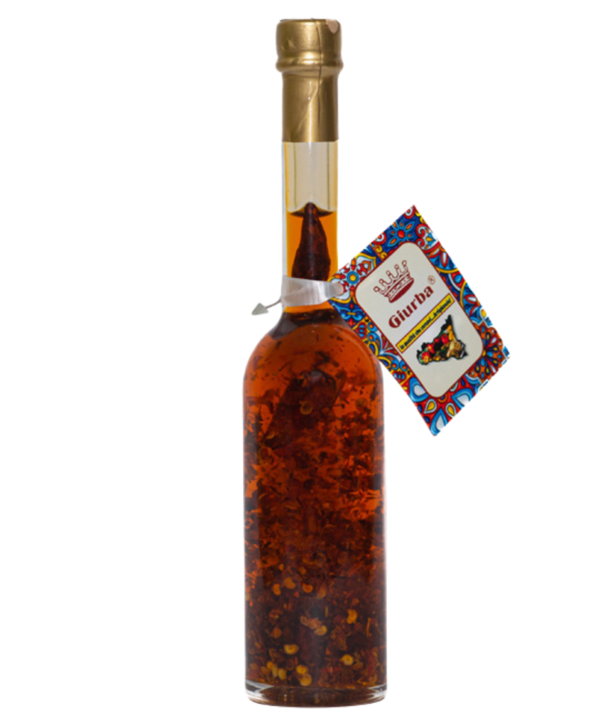 Olive oil infused with chili peppers, delivering a spicy kick and aromatic heat ideal for enhancing dishes or as a dipping oil.