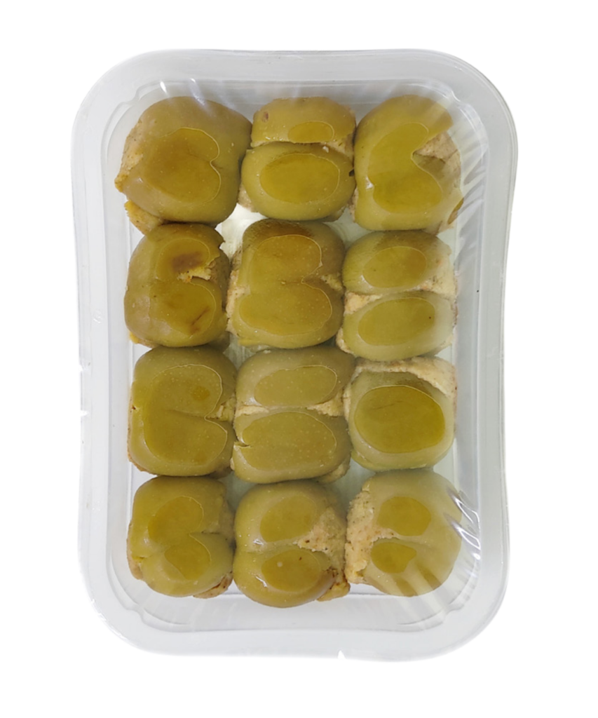 Stuffed olives in the Messina style, filled with a savory blend of herbs and spices, offering a tangy and aromatic bite.