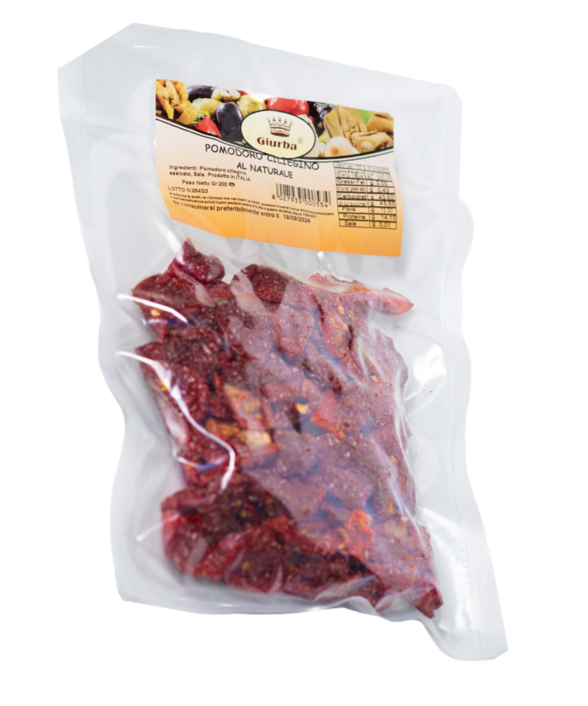 Cherry tomatoes sun-dried to perfection and packed without oil, retaining a pure, concentrated flavor ideal for various dishes.